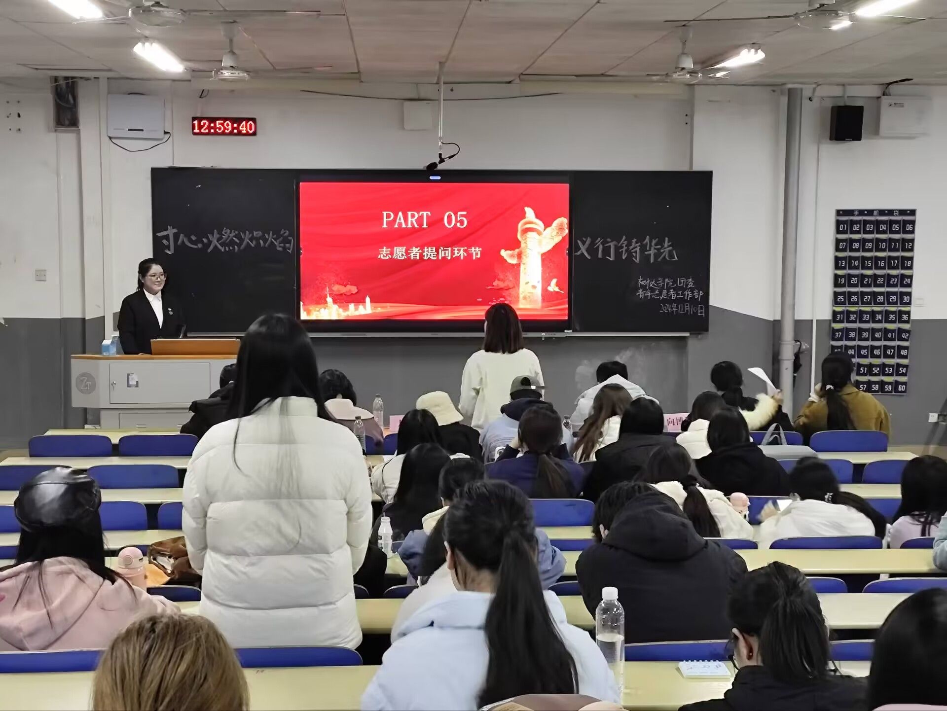 龙珊作总结发言。她表示,此次宣讲会主要有两点意义,一是弘扬志愿者精神,感召学生加入志愿服务,壮大志愿者队伍;二是提升了志愿者素养,有利于开展公益服务,营造了互助奉献的校园氛围。她强调,全体学生都应该走出校园,积极参加志愿活动,做更多有意义的事情。