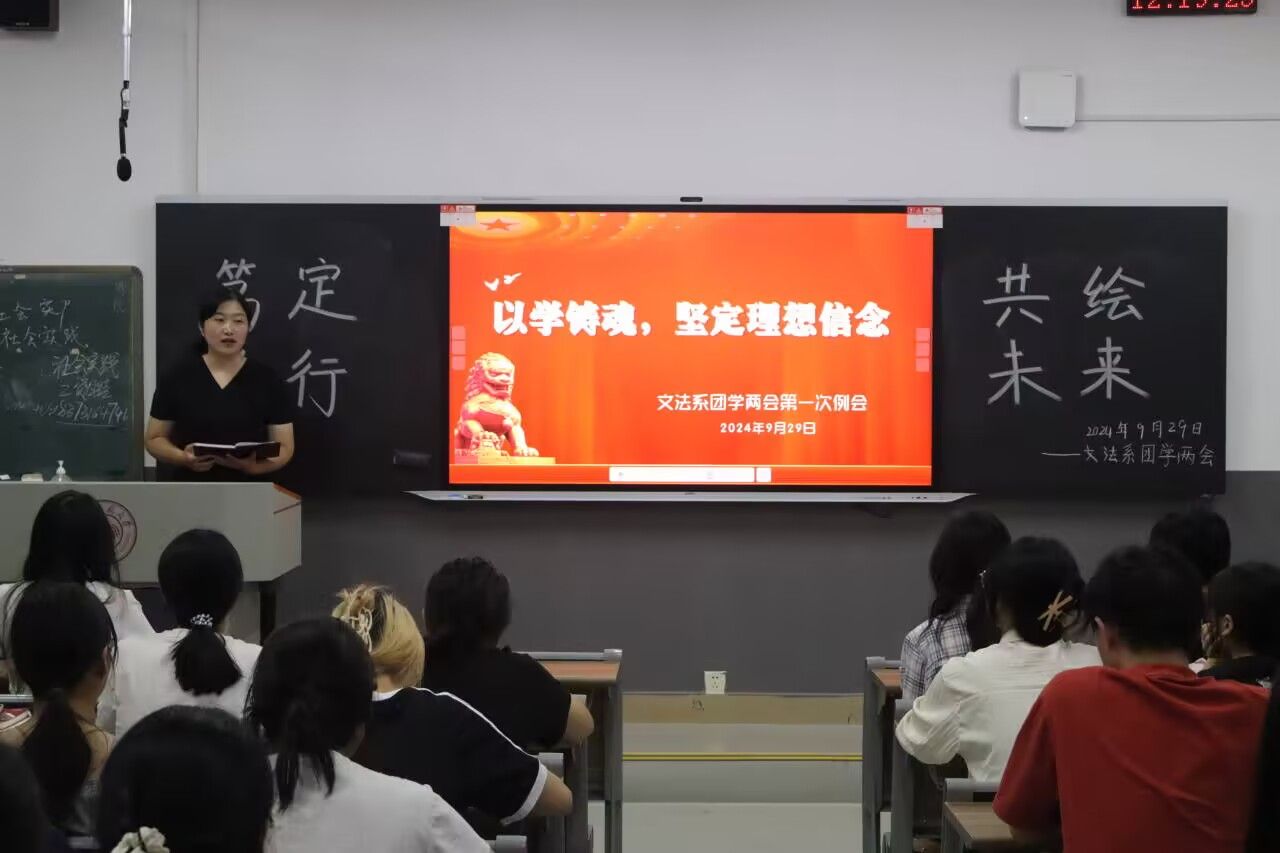 文法系团总支学生副书记简翠峰和文法系学生会主席团成员肖逸航依次作上年度团学两会成果汇报,并对本年度计划和后续工作提出要求。