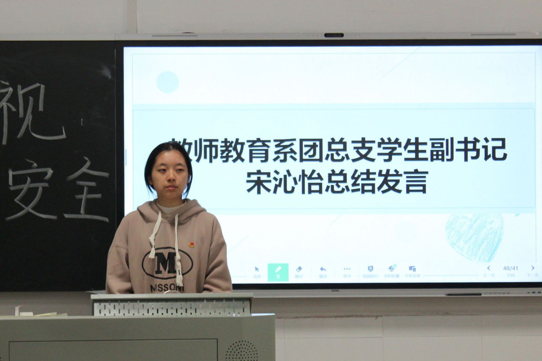 团总支学生副书记宋沁怡作总结发言。她表示,此次团日活动旨在为团员们普及安全知识,提高团员们的安全防范意识,将安全隐患防患于未然。她希望,团员们要在日常生活中遵守各项规定,共同创造一个安全、和谐的学习生活环境。
