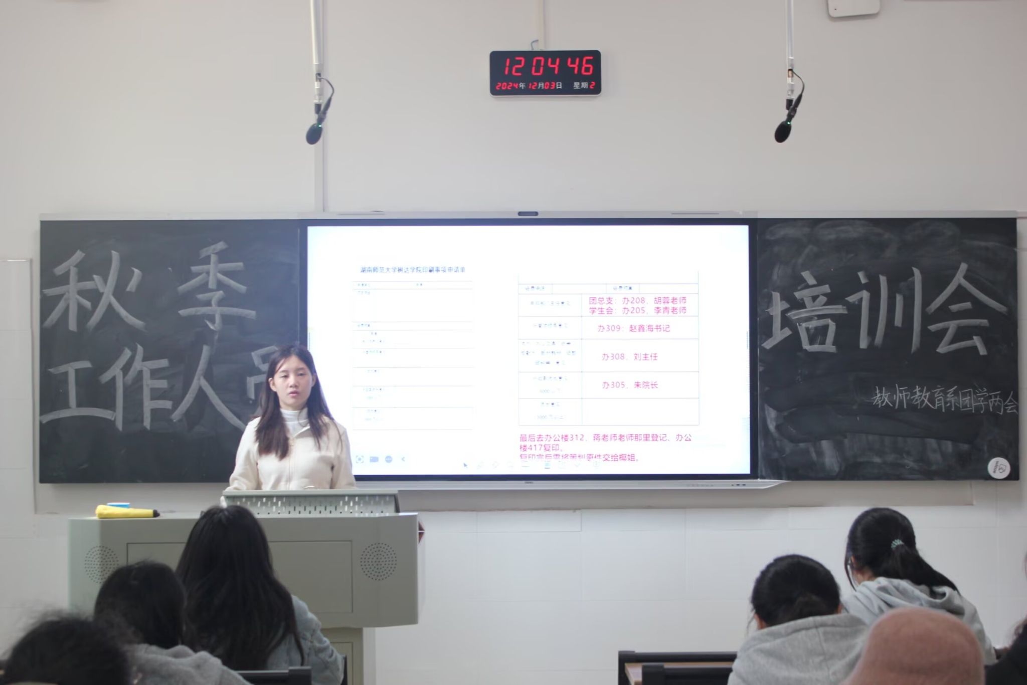 贺思宇围绕活动的开展,阐述了如何写好活动策划书和如何按照流程签策划、批教室;学生会主席团成员袁婷讲解了通知的编辑及规范问题;团总支学生副书记宋沁怡就开展活动和会议文件文字格式和排版进行了说明。