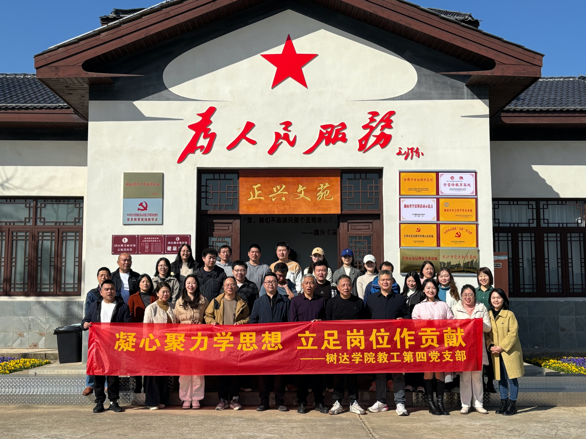 全体党员观看了影片《志愿军 存亡之战》,并参观了团山湖雷锋精神教育实践基地,学习了雷锋同志在团山湖村参与治理沩水、骑马送信、打硪车水、防洪抢险、拌禾插田的故事。在团山湖村的燕来新风馆内,团山湖村党总支书记、村委会主任程府迎为大家介绍了团山湖村以传承“雷锋精神”为核心的研学教育、智慧生态农业、文旅康养三大产业。