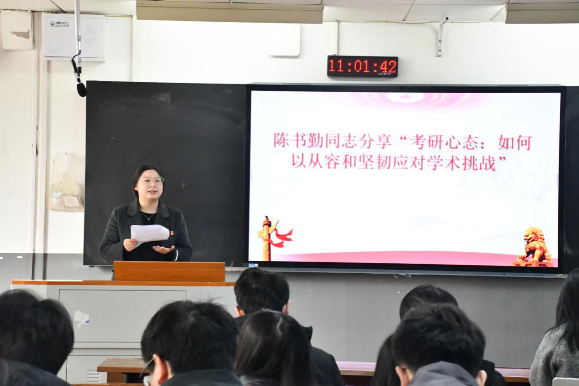 正式党员陈书勤结合自身经验,就如何调整并保持良好考研心态提出了四点建议。一是要明确目标,坚定信念,不忘初心,坚定奋斗决心;二是要保持良好的心态,学会用发展的眼光看待问题;三是要有效的管理时间,学会调节情绪,稳扎稳打、步步为营;四是要建立互助共享的学习氛围,有效利用团队合作,打造高效的学习共同体。