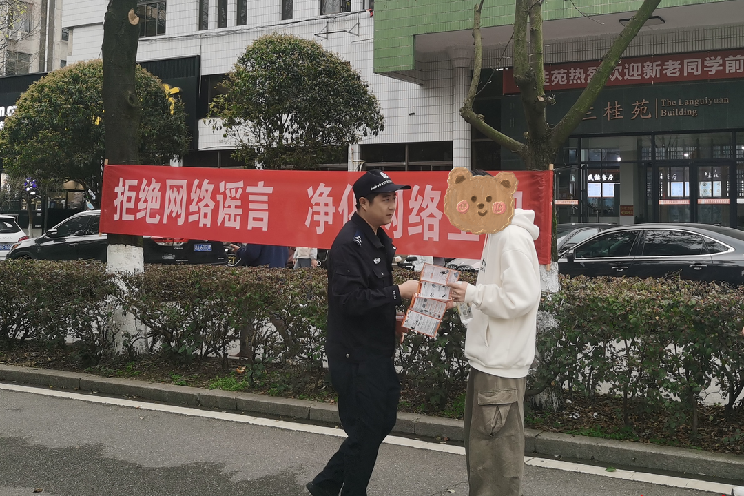 “互联网时代,面对大量的碎片化、多样化的信息,以及网络谣言的万千套路,作为互联网时代的建设者、参与者与共享者,请你与派出所、与社区一起,击破身边的谣言。”桔子洲派出所辅警何俊说道。