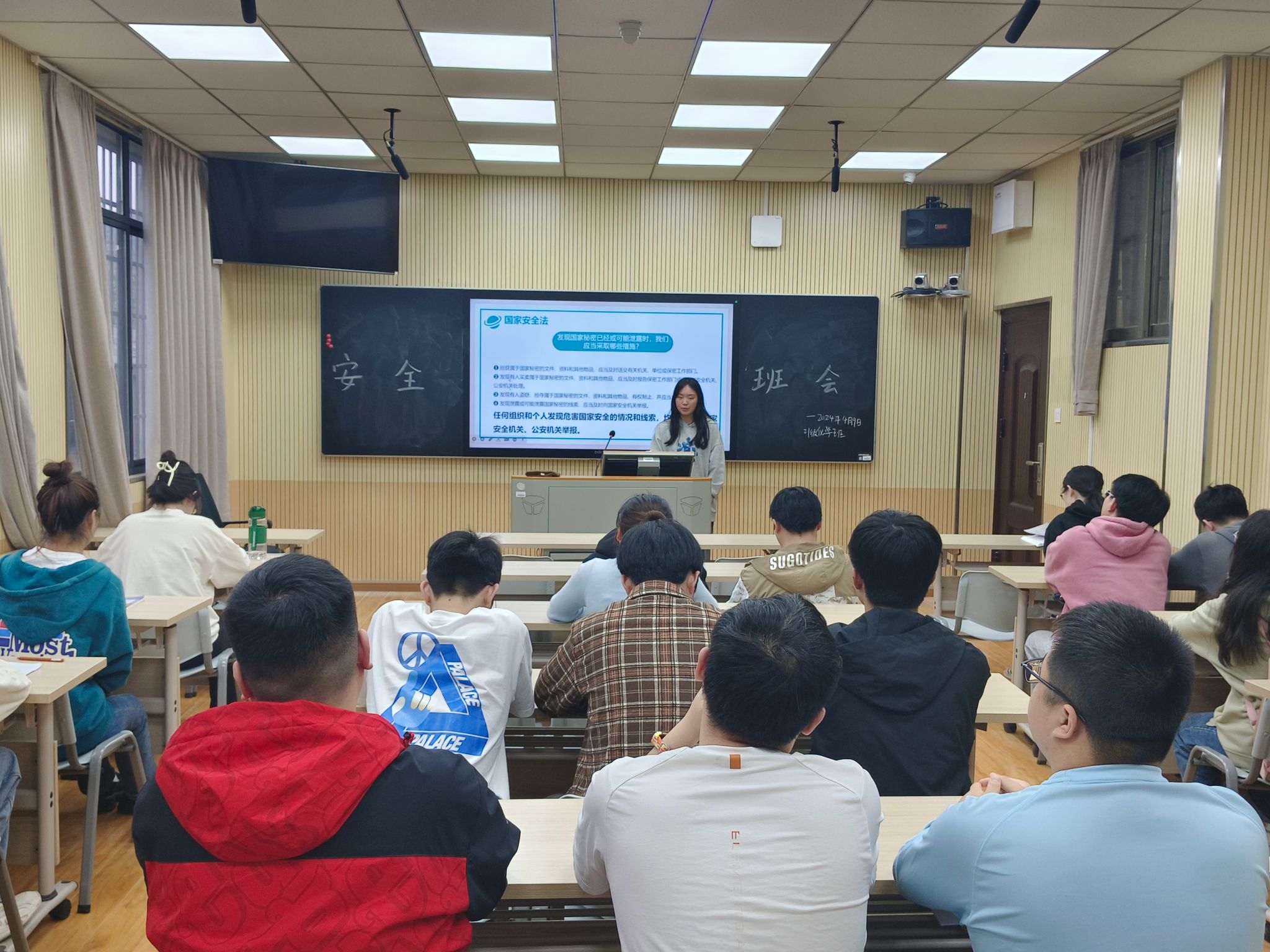 谢晶结合真实案例带领同学们了解国家安全法、反间谍法和反恐怖主义法。她表示,作为一名大学生,要自觉维护国家安全,增强国家安全意识和保密意识,做到内外网不混用,军事重地等区域不随意拍照,筑牢安全防线。