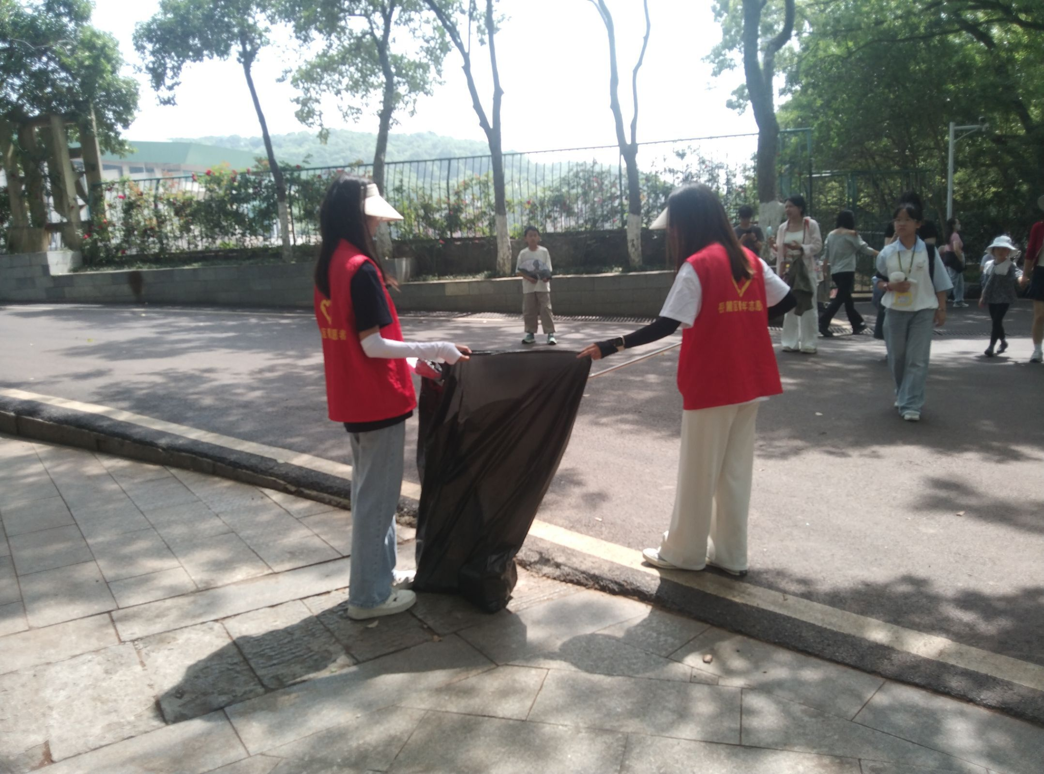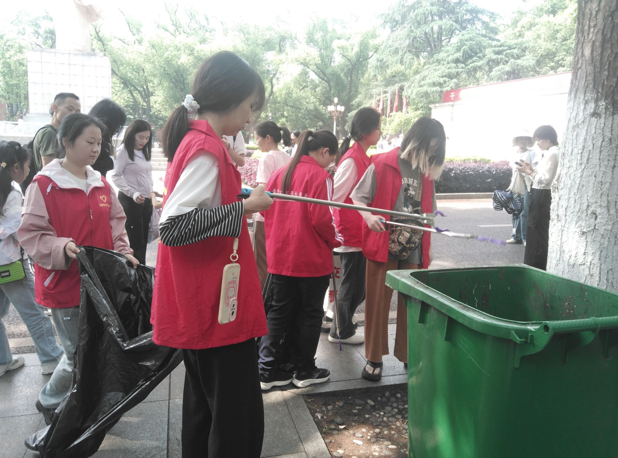 志愿者们分时段、分批次开展志愿活动,并统一身穿红色马甲,在景区拉起警戒线,指引游客规范通过马路,协助交警维持交通秩序,规范摆放和整理道路两旁的非机动车辆,同时对广场周边的环境进行清理,维护景区卫生的干净整洁。