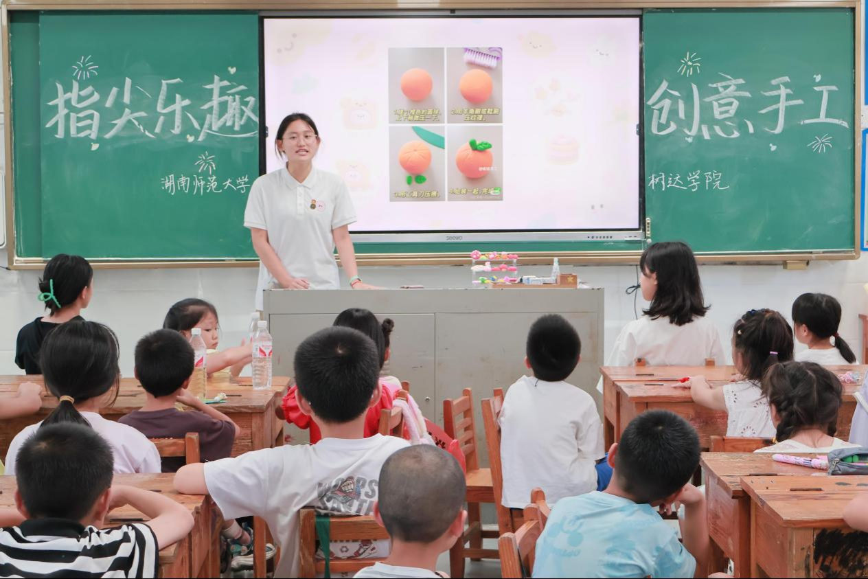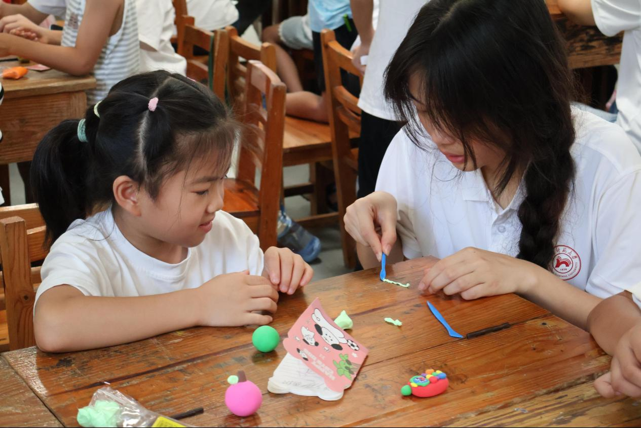 郑嘉以“自然美学”为切入点,带领学生感受手工创作的魅力。她详细教授了学生基础技法,并鼓励他们发挥想象,大胆创作。同学们利用手中的粘土,自由组合色彩与形态,制作出各种各样的花朵、蛋糕等手工作品。她表示,此次特色课堂丰富了小河乡学生们的暑期生活,有利于提升他们的文化认同感和艺术审美能力,也加深了实践团成员对乡村教育的理解,增强了服务基层、奉献社会的责任意识。实践团将继续探索更加多样化的特色课堂,助力乡村学生全面发展。