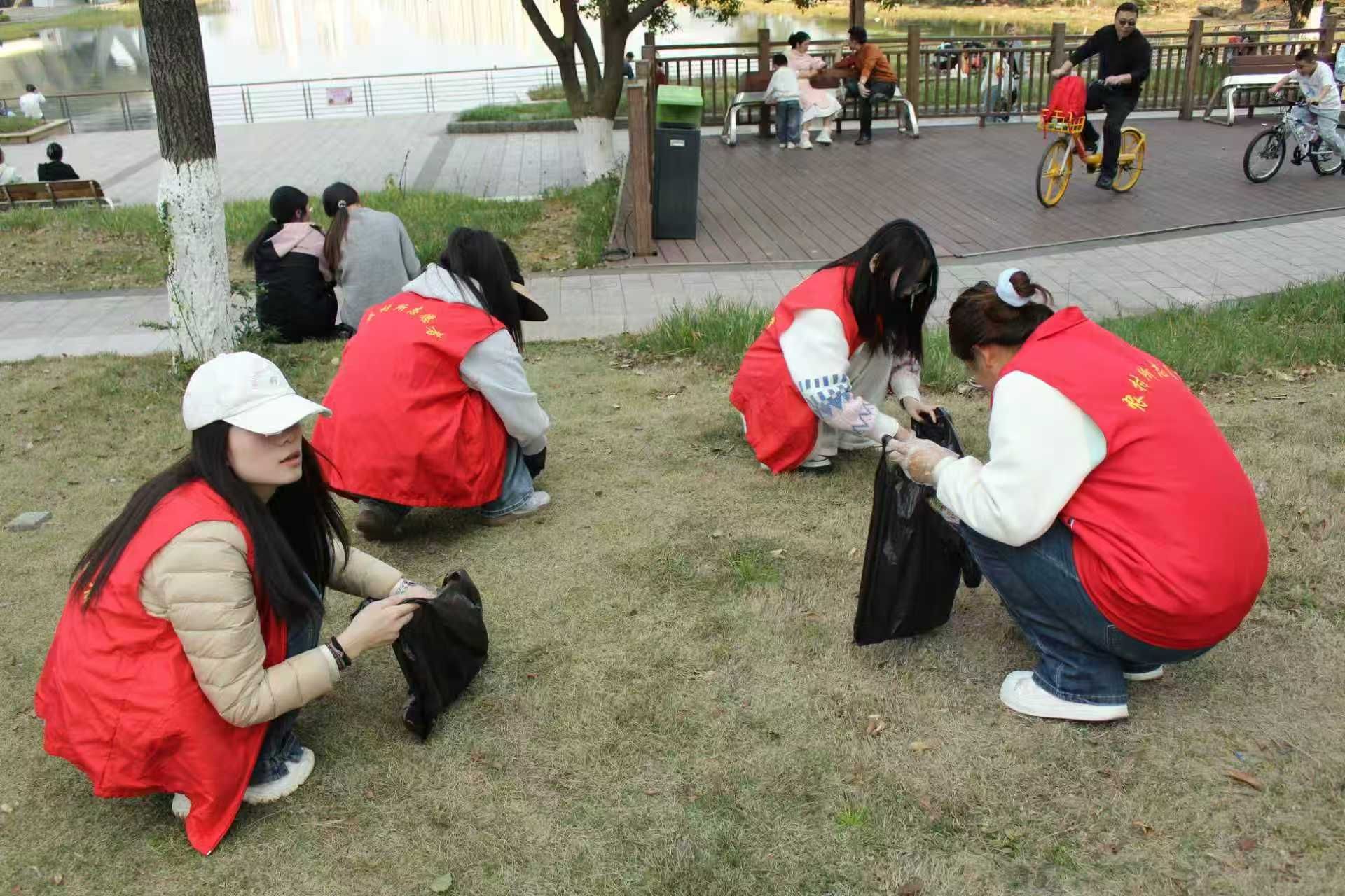 成员在湖边开展白色垃圾清理志愿行动,以实际行动践行环保担当,强化责任意识、锤炼服务本领。