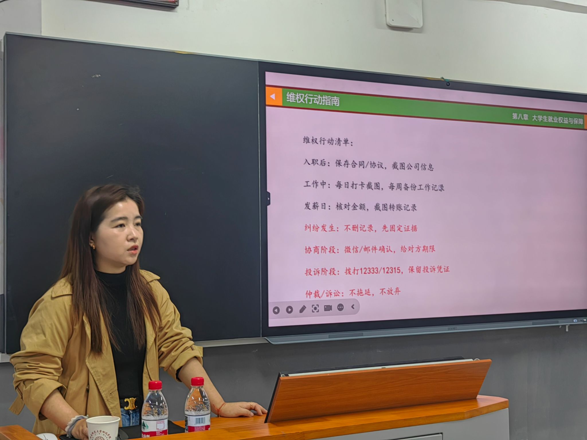陈安琪结合自身专业优势与就业市场实际案例,围绕大学生兼职实习、求职就业两大核心场景,系统拆解了常见求职陷阱,详细讲解了录用通知(offer)、就业协议书、劳动合同三类协议的区别与风险,梳理了从固定证据、协商沟通到第三方介入、法律途径的全流程合法维权路径,清晰解答了同学们在兼职、实习、求职过程中的权益疑问。