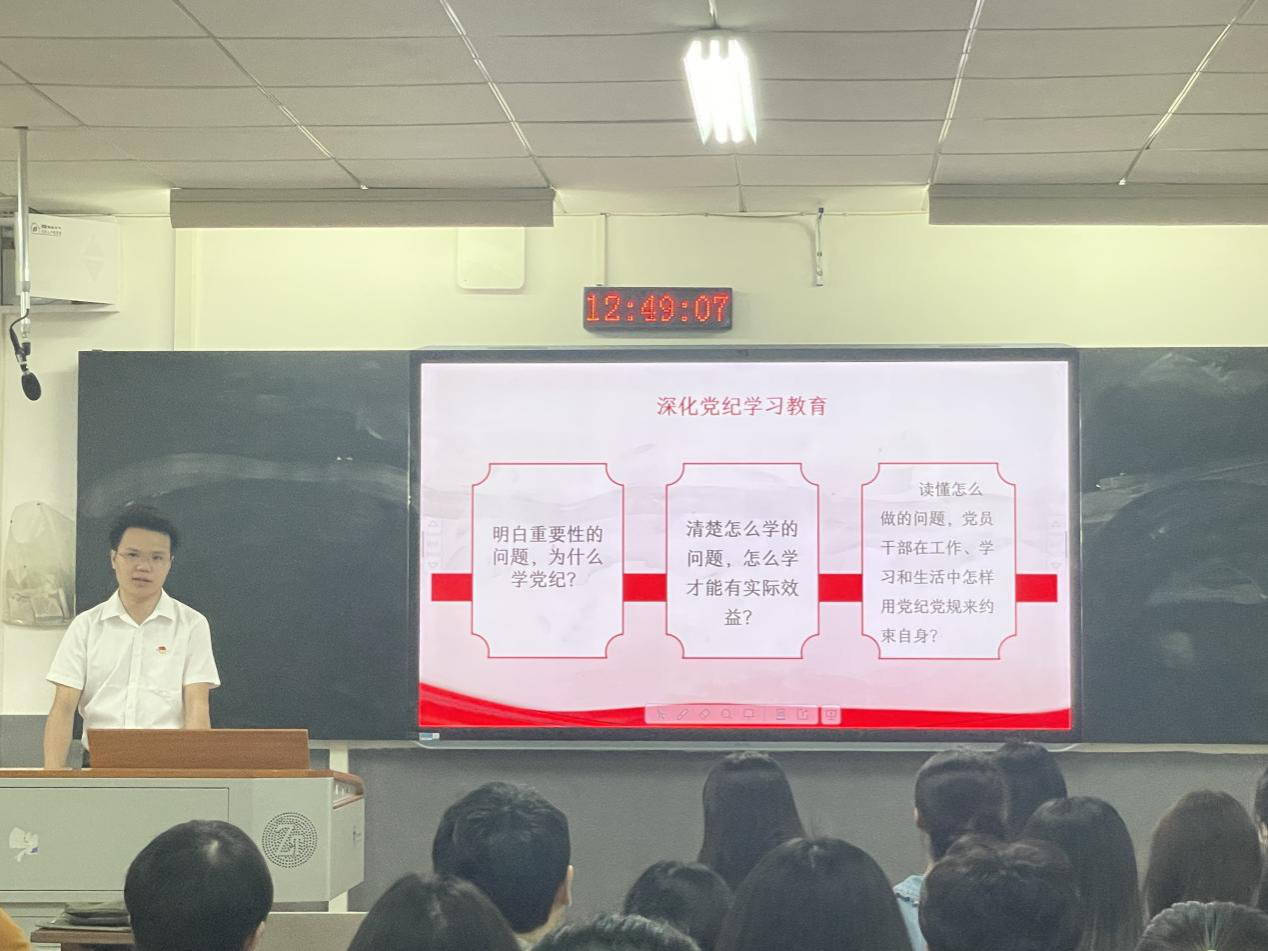 (记者 曾茜 蔡雅婷)4月28日中午,威廉希尔中文网站平台文法系学生第一党支部在树达楼206教室开展党纪学习教育主题党课。文法系学生第一党支部第一书记毛一出席党课。党课由预备党员杨新熠主持。